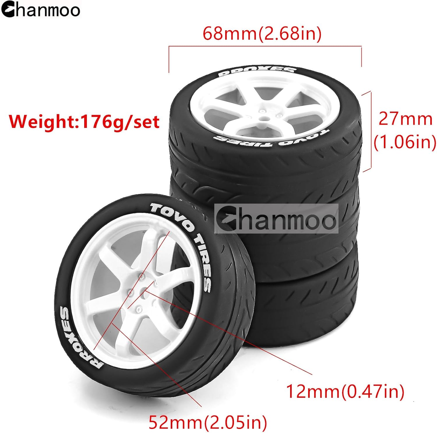 ✔This 1/10 rc on road car tires drive hex: 12 mm(0.47 in);outer diameter: 65 mm (2.56 in);inter diameter:52 mm (2.04 in);width:22 mm(0.87 in).Please check the 1/10 rc tires size info before buying.